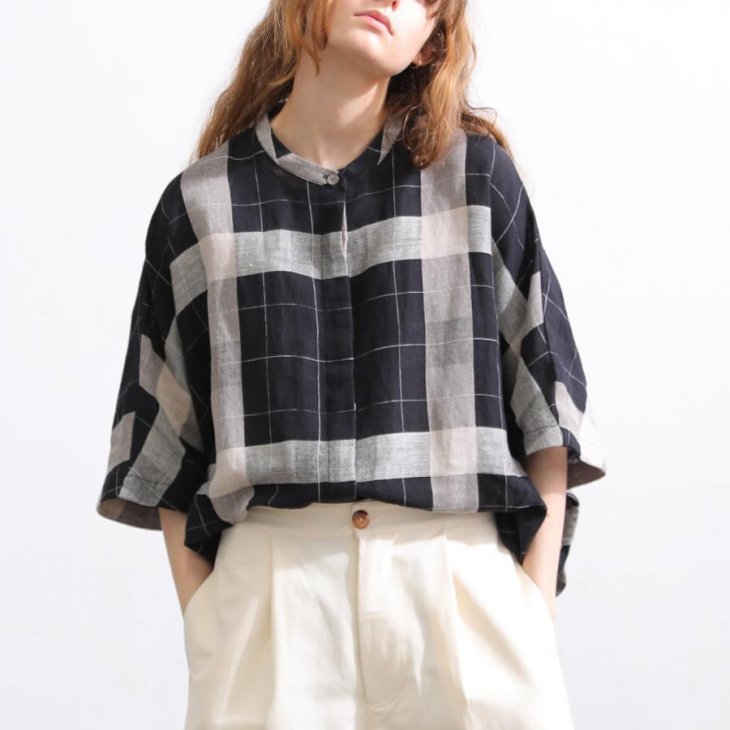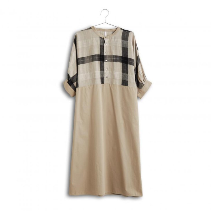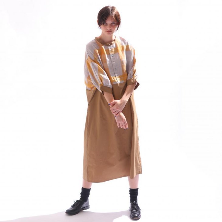 ブロックチェックとコットンタイプライター素材で切り替えたドルマンスリーブワンピ。