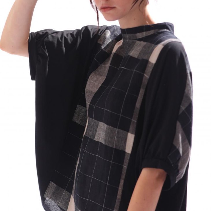 大柄のブロックチェックと布帛見えのカットソーを組み合わせたプルオーバートップス。