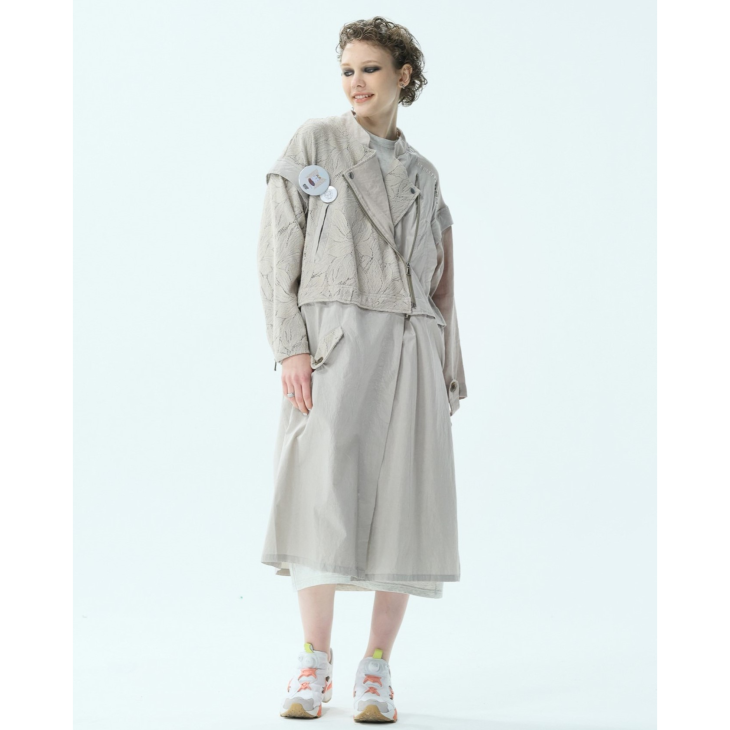 フランケンシュタインのように異素材でつぎはぎされたスプリングコート。