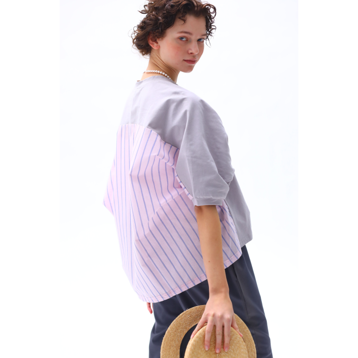 カットソーと布帛を使用した異素材コンビトップス。